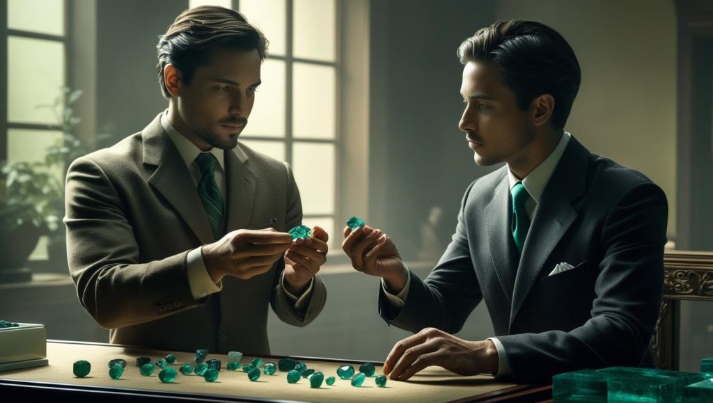 TRADING BUYING AND SELLINS EMERALDS FOR COLONIAL GEMSTONES IN THE BACKGROUND